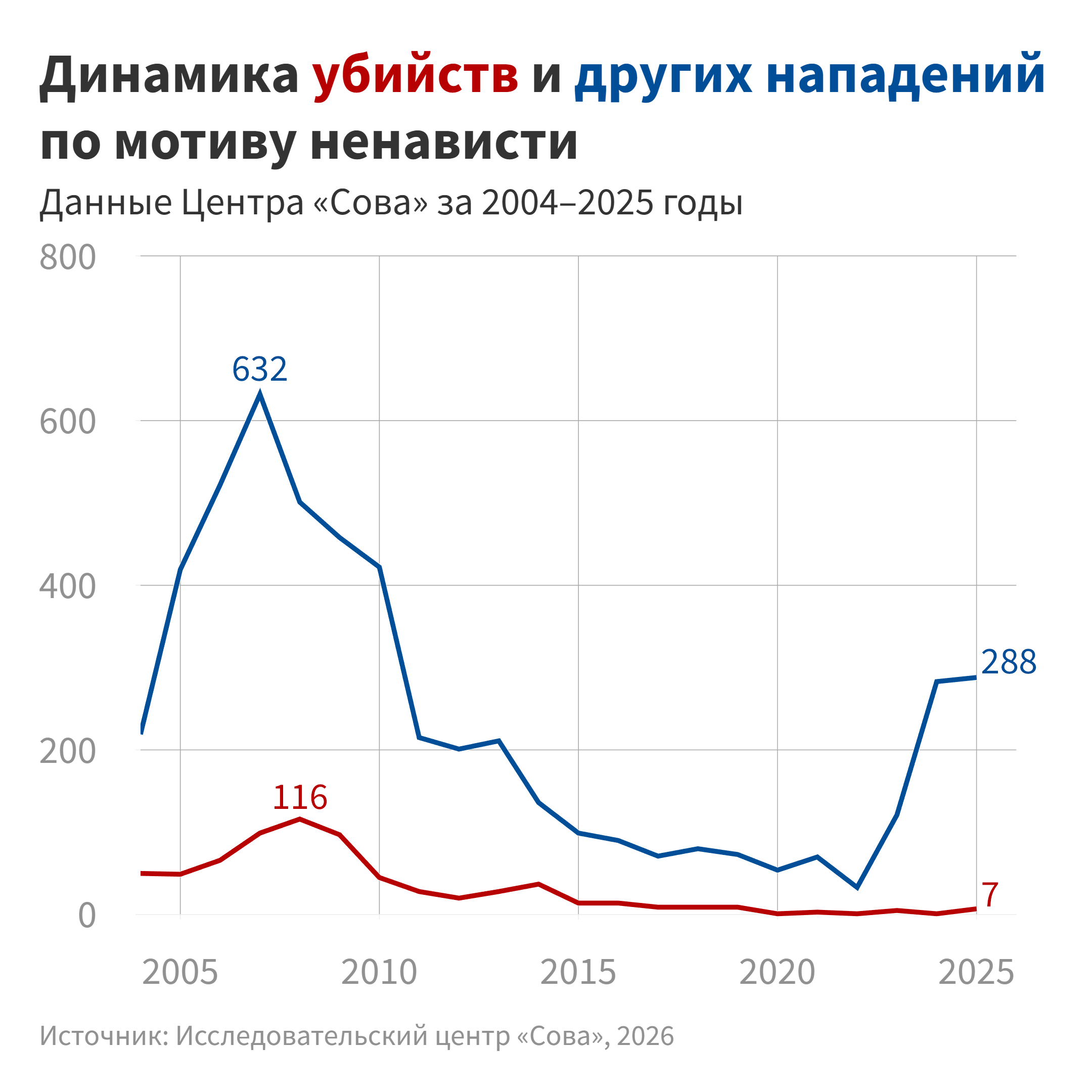 Уровень ксенофобного насилия вырос в 2025 году не столь значительно, как годом ранее, но наблюдается качественное ухудшение ситуации: возросла жестокость нападений, стало расти количество убийств, среди жертв — в том числе среди убитых — оказались и дети.
