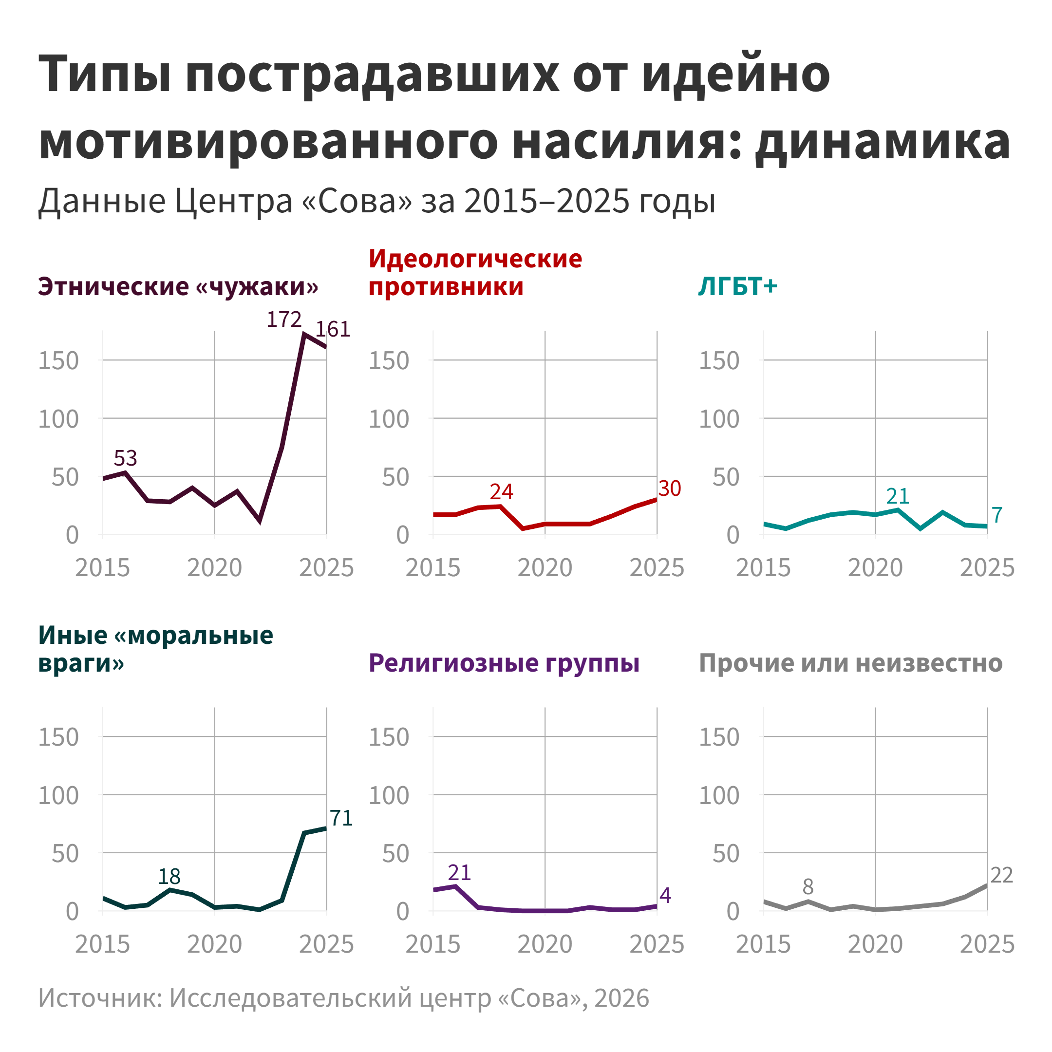 В 2025 году мы зафиксировали 161 нападение по этническому признаку, то есть атак на тех, кого нападавшие визуально воспринимали как этнических чужаков. И это чуть меньше, чем годом ранее (172 нападения).