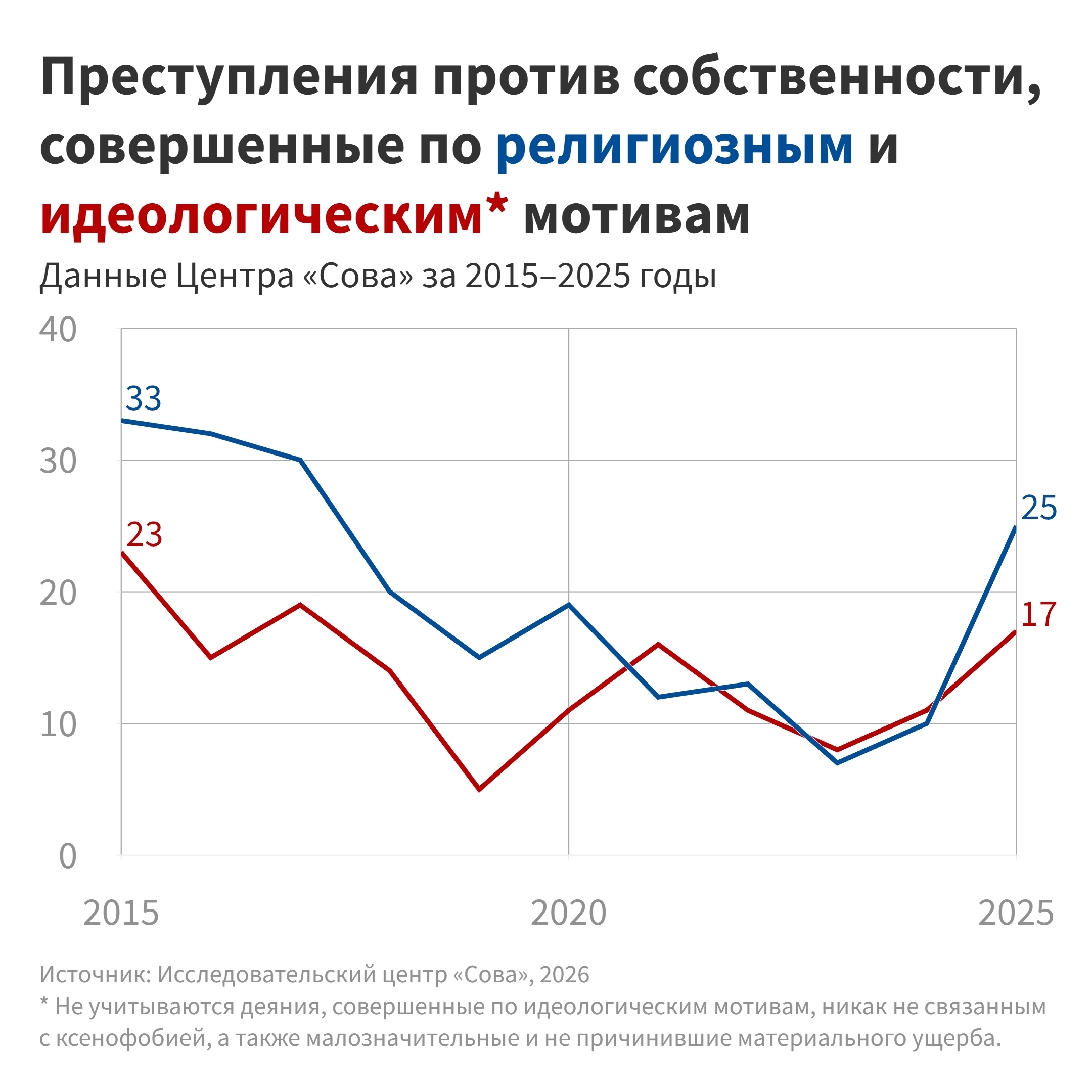 Количество преступлений против собственности, мотивированных религиозной, этнической или идеологической ненавистью, учитываемых Центром «Сова», резко выросло: за 2025 год мы узнали о 42 случаях в 18 или более регионах страны, за 2024 год — о 21 случае в не менее чем 10 регионах[22].