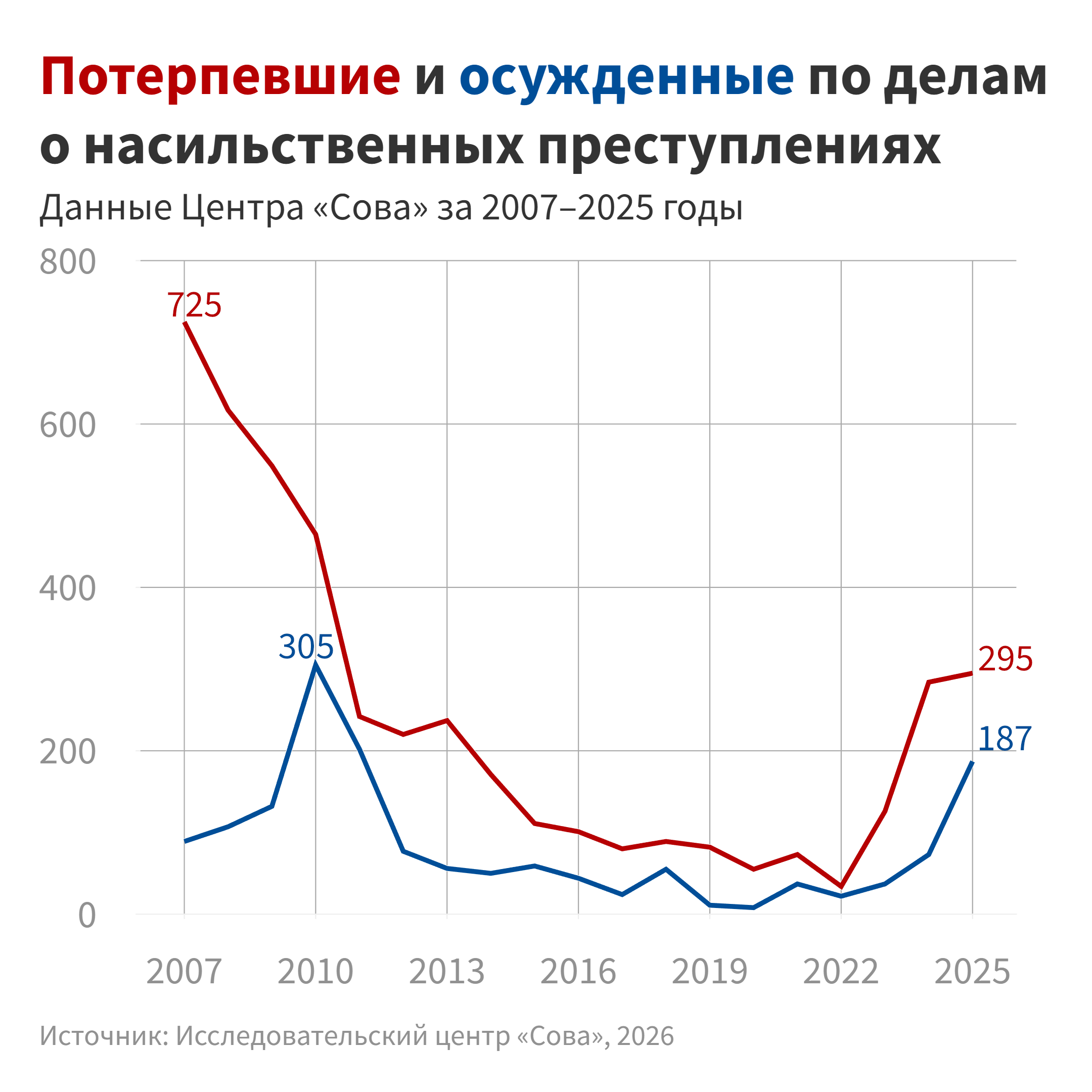 В 2025 году количество известных нам осужденных за насильственные преступления по мотиву ненависти оказалось в два с лишним раза выше, чем годом ранее. Годом ранее количество осужденных выросло ровно вдвое. В 16 регионах страны было вынесено не менее 41 приговора, в которых судами был признан мотив ненависти. В этих процессах были осуждены 187 человек (в 2024 году — 73 человека в 15 регионах)[23].