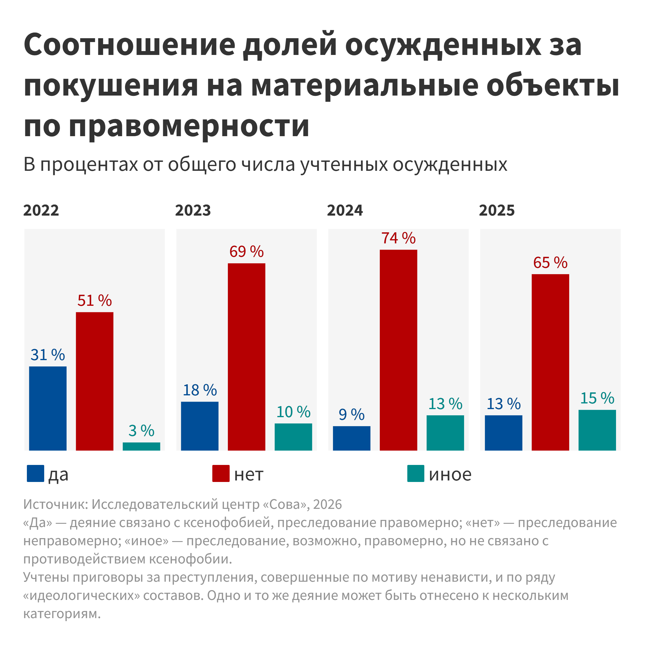 С ростом числа покушений на материальные объекты правоохранители тоже борются активнее: осуждено было на 60 % больше людей, чем годом ранее. Но это правоприменение уже четыре года направлено преимущественно не на преступления ненависти, а на иные акции, затрагивающие материальные объекты. С одной стороны, в 2025 году стало больше приговоров за этноксенофобный вандализм и меньше за деяния, выражающие протест против властей (в том числе в связи с Украиной). С другой стороны, в два с лишним раза выросло число приговоров в защиту «традиционных ценностей»[1], и они составили 65 % от общего числа. Доля приговоров, которые мы сочли явно неправомерными, составила тоже 65 %, что, правда, меньше, чем год назад (74 %) или два года назад (69 %).