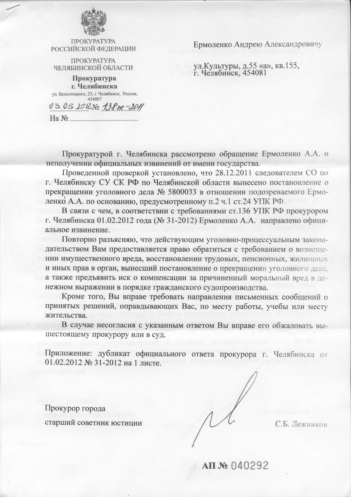 15 мая 2012 года появилась информация о том, что прокурор Челябинска Сергей Лежников направил А. Ермоленко письмо с официальными извинениями от имени государства. А. Ермоленко имеет право обратиться в Следственный комитет по Челябинской области с требованием о возмещении имущественного вреда и предъявить иск о компенсации морального вреда, требовать направления письменных сообщений о реабилитации по месту работы, учебы или месту жительства, а также требовать от СМИ публикаций о судебном решении, если сведения об уголовном деле появлялись в прессе.