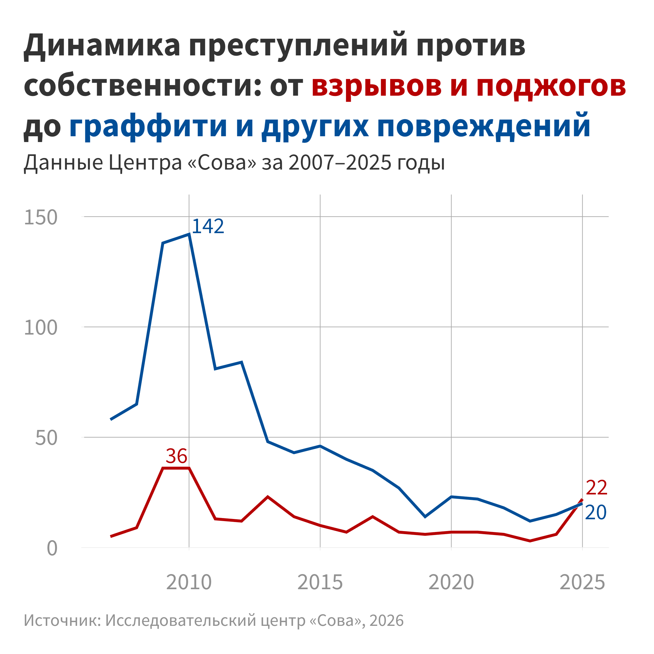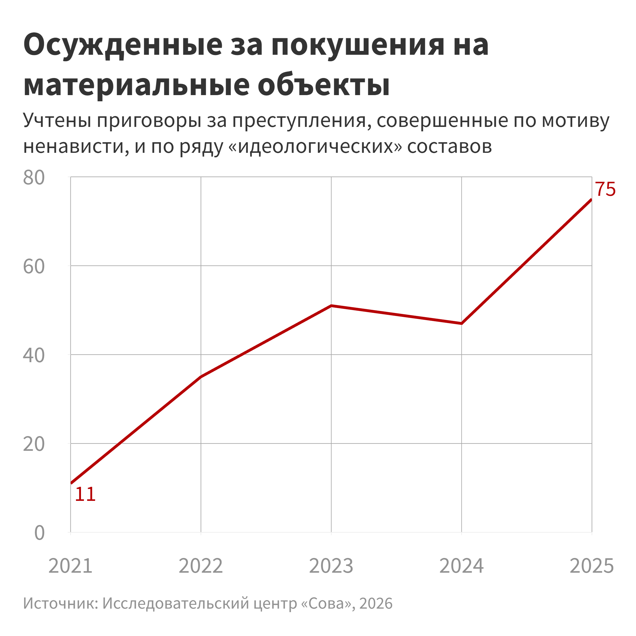 [38] Перечень статей ниже, строго говоря, не полон: идейно мотивированные покушения на материальные объекты иногда могут быть квалифицированы и по другим статьям УК, применение которых Центр «Сова» в целом не отслеживает. Например, в 2025 году мы знали о приговорах, в которых фигурировали ст. 2434 (уничтожение, повреждение либо осквернение воинских захоронений или памятников, посвященных защитникам Отечества) и ст. 329 (надругательство над государственным гербом или государственным флагом России).